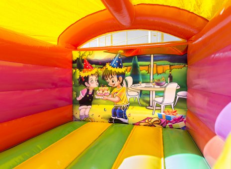 Het springkussen Mini Feest overdekt heeft een mooie full colour print op de achterwand, wat het springkussen een geweldige uitstraling geeft! De vrolijke kleuren groen, oranje en geel maken dat het feestelijke thema helemaal tot leven komt!